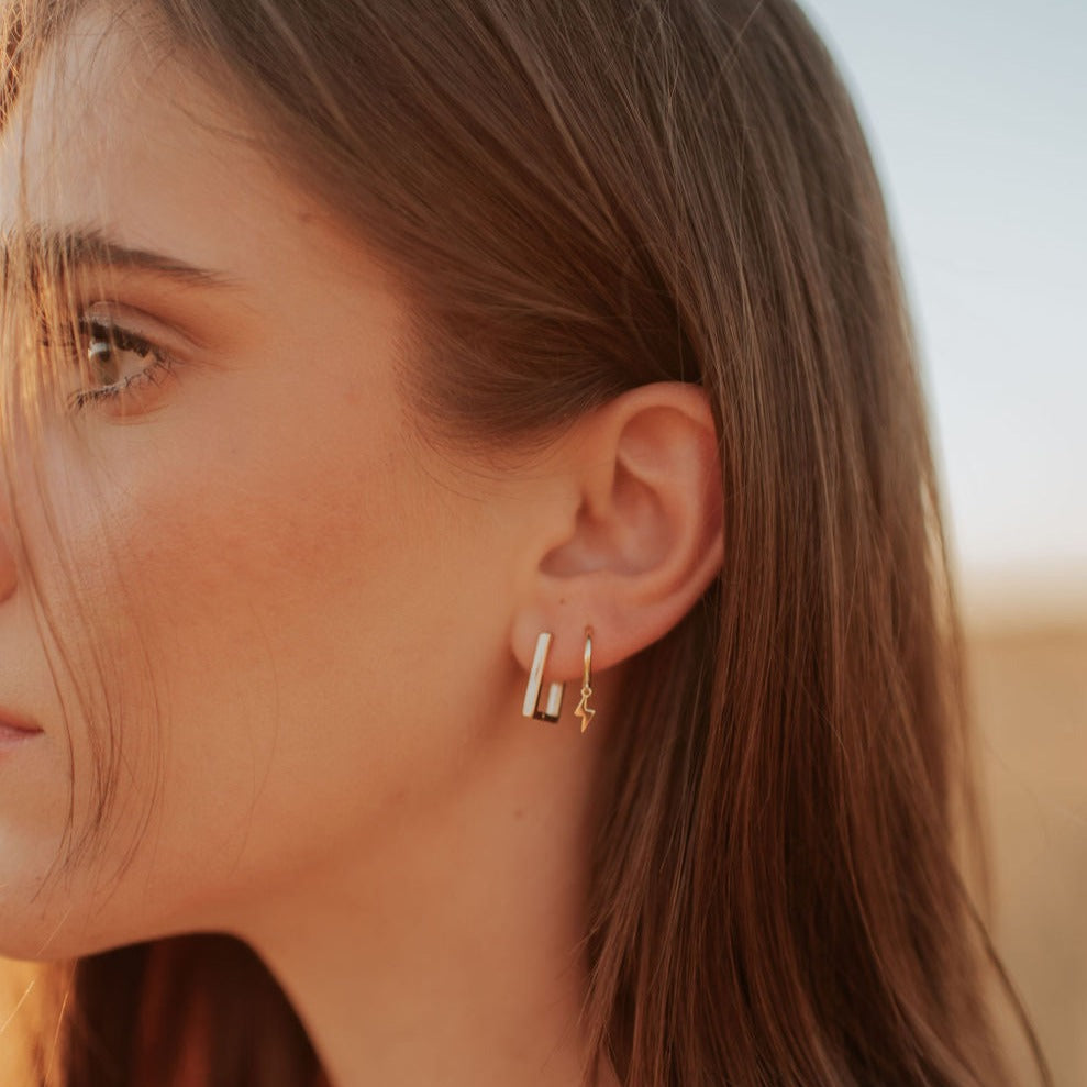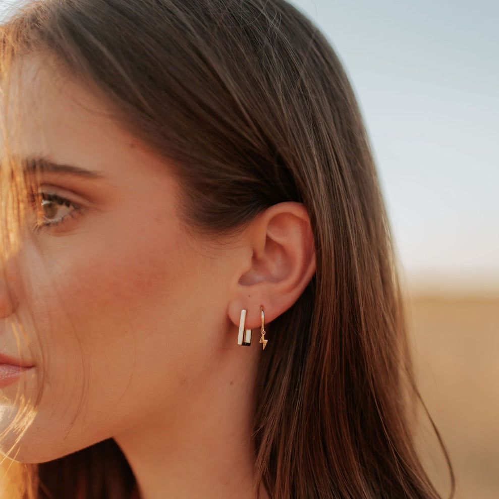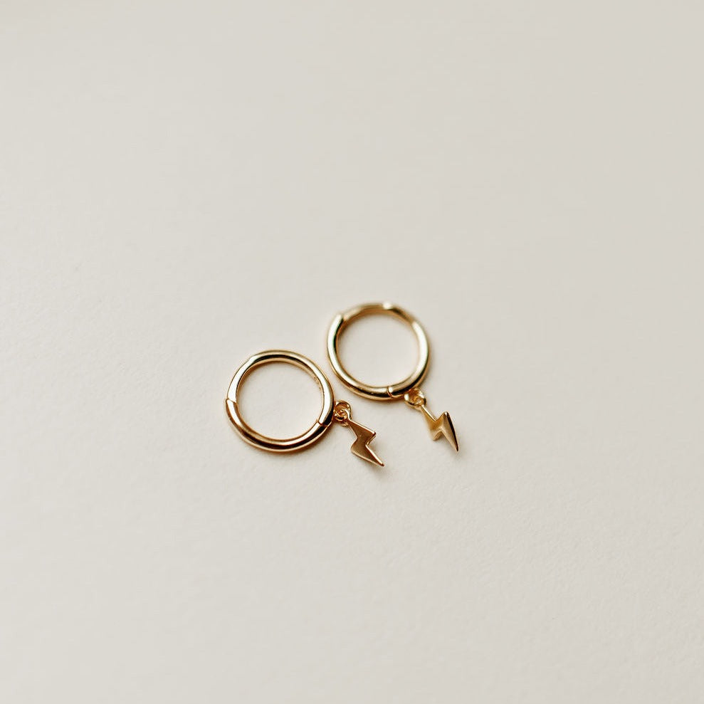 The Lightning Hoops are the perfect accessory for any outfit. Available in high quality gold vermeil, these huggies are hypoallergenic, good for sensitive skin, and wear and tarnish resistant. Outer diameter is 12mm.