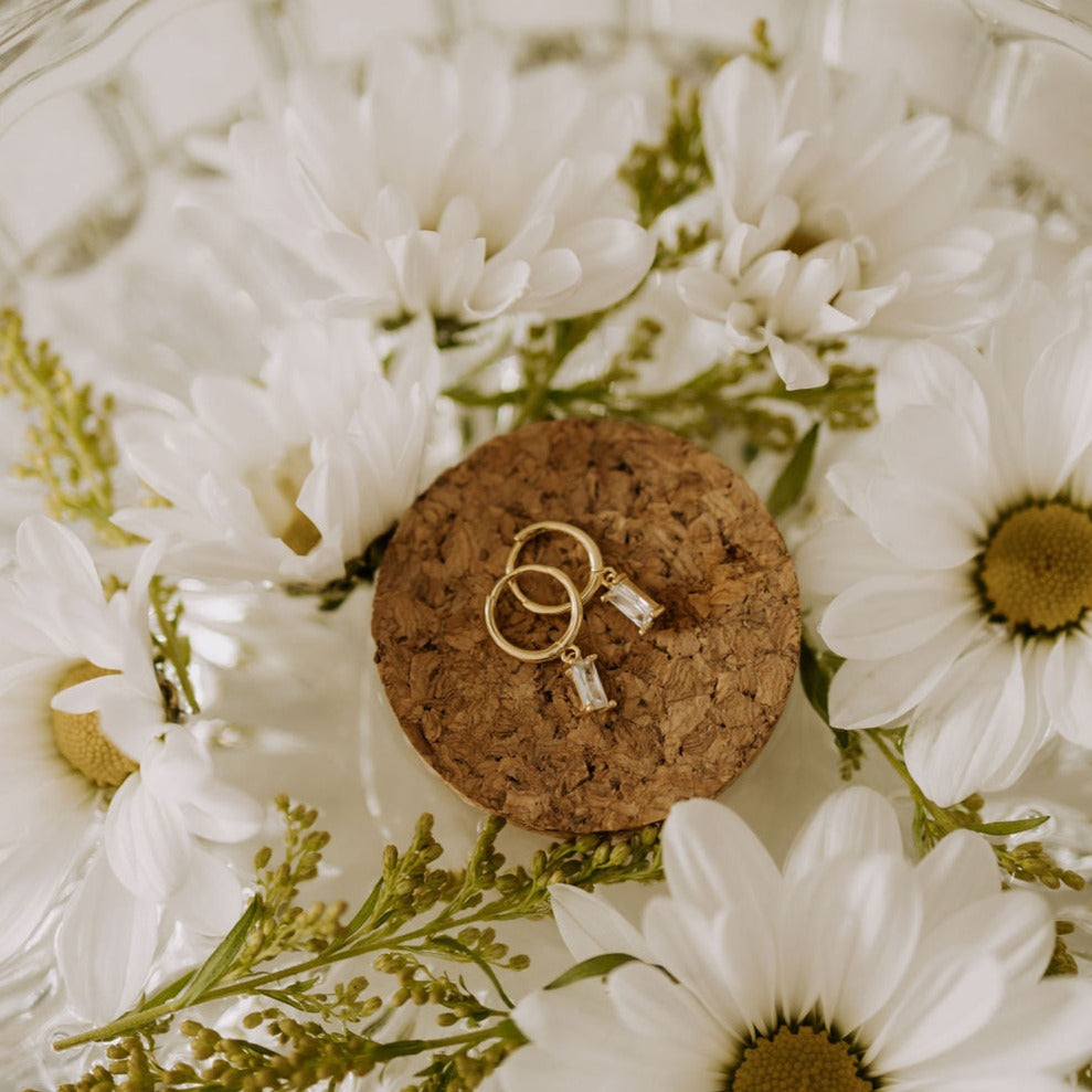 The Sophie Baguette Diamond Dangle Hoops are the perfect accessory for any outfit. Available in high quality sterling silver and gold vermeil, these huggies are hypoallergenic, good for sensitive skin, and wear and tarnish resistant. Diamond is made of high quality cubic zirconia. Outer diameter is 9mm.